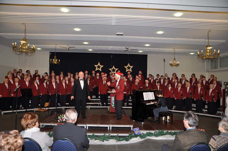 Franz-Josef singt das Solo in der Zugabe: Wir wünschen euch frohe Weihnacht. Die Männer haben sich verkleidet.