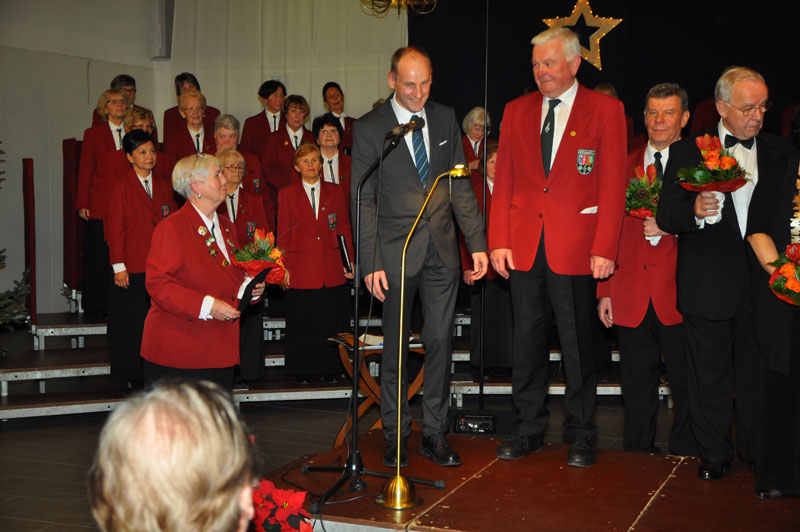 Hausherr Schützenoberst Dirk Koch bedankt sich begeistert bei den Vorsitzenden des Chores.