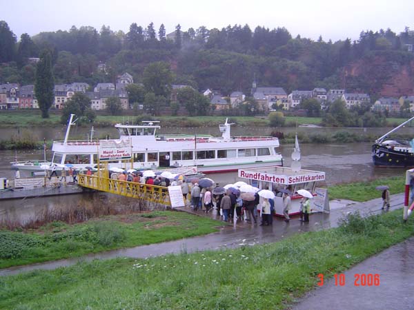 Dieses Foto hat die Bildnummer 06CHR-028 Leider im Regen startete unsere 4stündige Mosel-Schifffahrt flussabwärts nach Bernkastel-Kues. So kamen unsere weißen Schirme auch mal zur Geltung! |