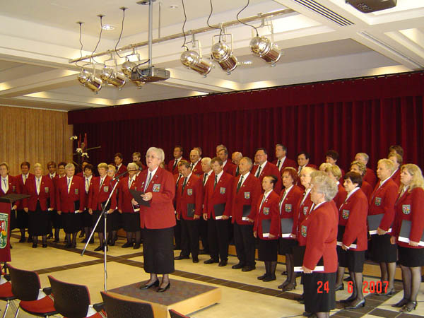 Dieses Foto hat die Bildnummer 07CHR-011 Unsere relativ kleine Sängerschar vor dem Auftritt in der Wandelhalle des Kurhauses in Bad Zwischenahn. Es waren zahlreiche Zuhörer und Zuhörerinnen erschienen. |