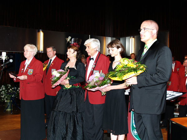 Dieses Foto hat die Bildnummer 08FKZ-050 Gratulation mit Blumen an die Solisten Ellen May, Ellen Plem und Heiko Röder, an den Moderator Wolfgang Fischer und den Chorleiter und Dirigenten Alfons Puscher, überreicht durch die 1. Vorsitzende Hildegard Geppert. |