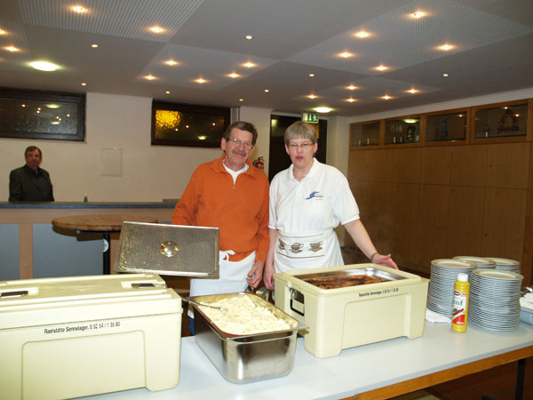 Dieses Foto hat die Bildnummer 08JHV-001 Nach der Begrüßung durch die 1. Vorsitzende Hildegard Geppert sorgte das Ehepaar Peterburs zunächst einmal für eine Stärkung mit leckerem Kartoffelsalat und Schnitzel. |