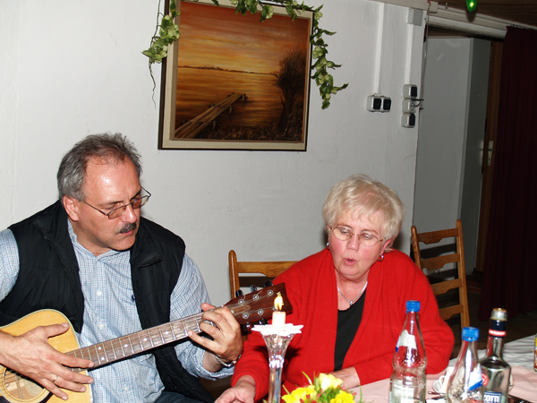Dieses Foto hat die Bildnummer 08SJR-032 Zu späterer Stunde werden mit Gitarrenbegleitung richtig schöne Volkslieder gesungen. Andreas und Hildegard. |