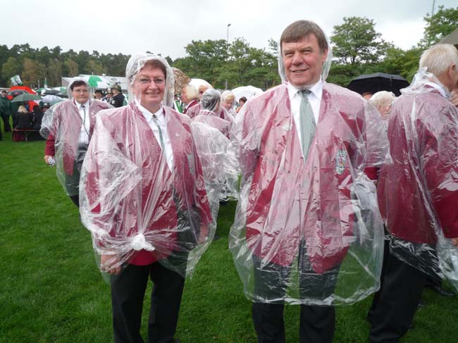 Dieses Foto hat die Bildnummer 09BKS-060 Gut, dass wir sie hatten. So waren unsere Jacken und die Hosen bis zu den Knien wunderbar regengeschützt. Rita hat sich noch einen besonderen Knoten einfallen lassen. |