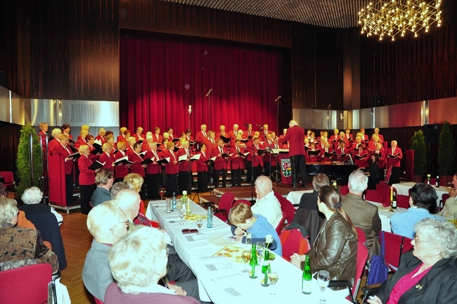 Dieses Foto hat die Bildnummer 09FKZ-049 Zahlreiche Chormitglieder in Rot "bevölkern die Bühne". Und die Bühne, das Podest, wird zu jedem Konzert von Chormitgliedern aufgebaut. Alles muss schließlich passen! |