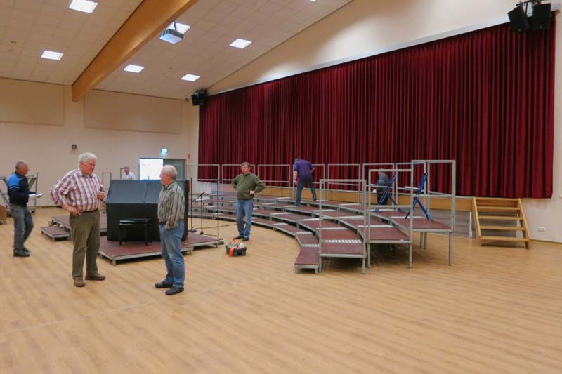 Vor der vorhandenen Bühne wird unsere aufgebaut. Auch das Klavier hat bereits seinen Platz. |