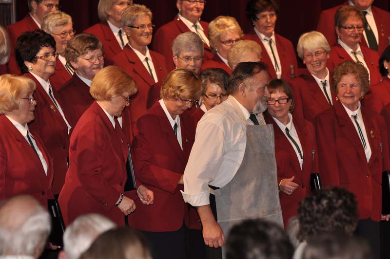 Josef Thorwesten ist auf seinen Einsatz vorbereitet. Beim Ankleiden der Schürze wird er von Gisela Struck unterstützt.