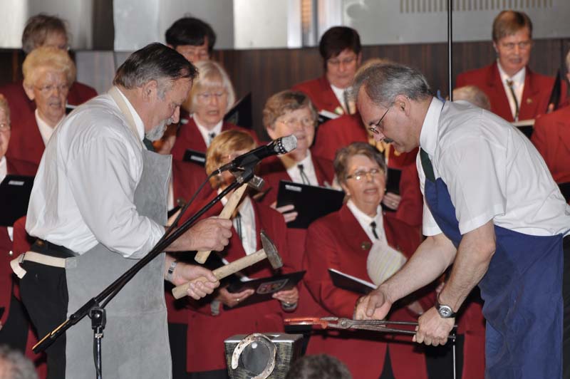 Ja, nun ist es klar: Josef Thorwesten und Andreas Driller bedienen den Amboss und der Chor singt die Amboss-Polka. Wichtig ist, dass der Takt stimmt!