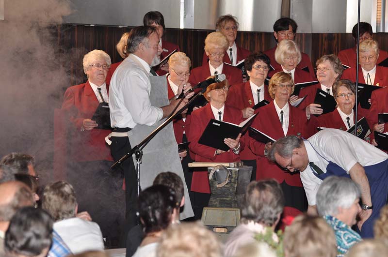 Nanu - in der Schmiede muss es wohl wirklich sehr heiß sein. Es dampft schon mächtig! Andreas hat das bearbeitete Eisenstück wohl in kaltes Wasser getaucht - oder? Die Amboss-Polka wird immer wieder gern gesungen und gern gehört.