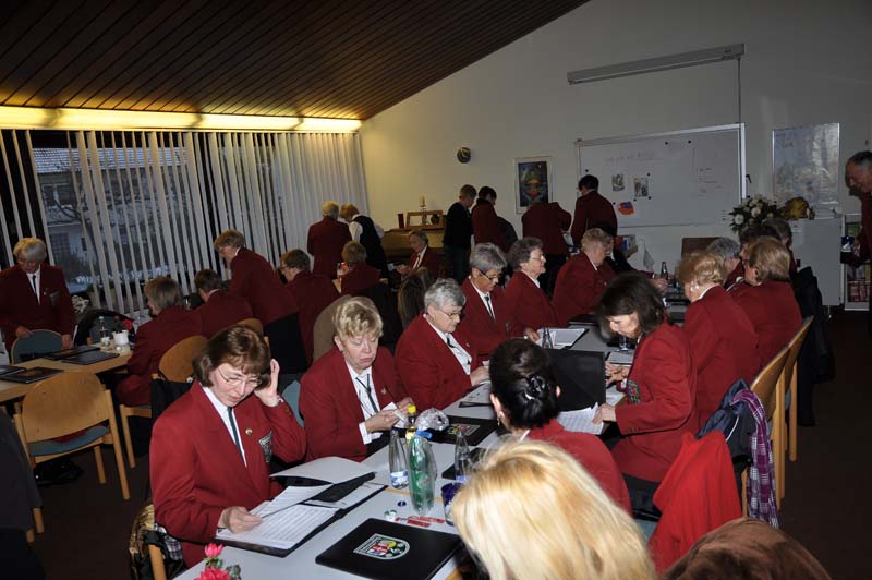Die Sängerinnnen und Sänger überprüfen die Noten und stellen sich auf das Konzert ein. |