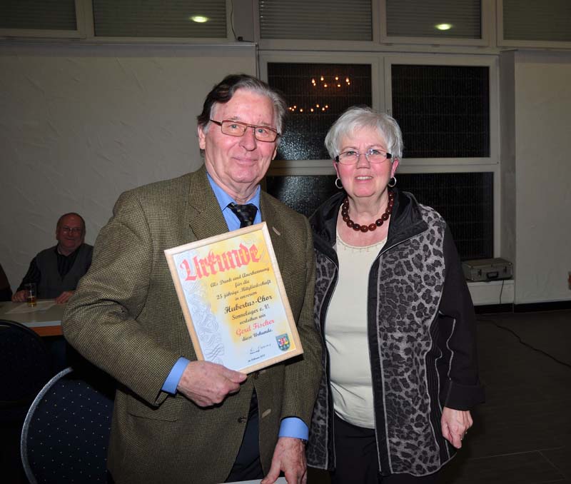 25 Jahre Chormitglied: Gerd Fischer. Die Urkunde erhielt er durch Hildegard Geppert. |