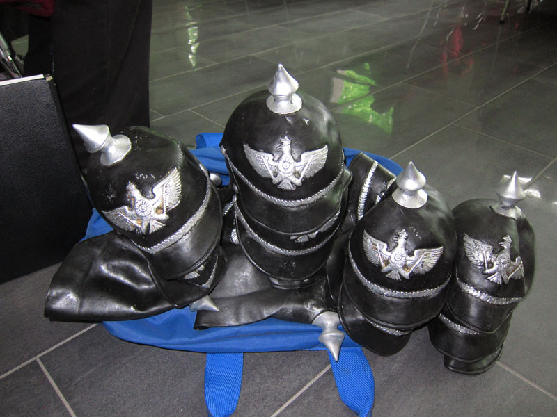 Gesammelte Pickelhauben für den Abtransport vorbereitet. Sie müssen gepflegt und gut versorgt werden für einen evtl. nächsten Auftritt mit den "Alten Kameraden".