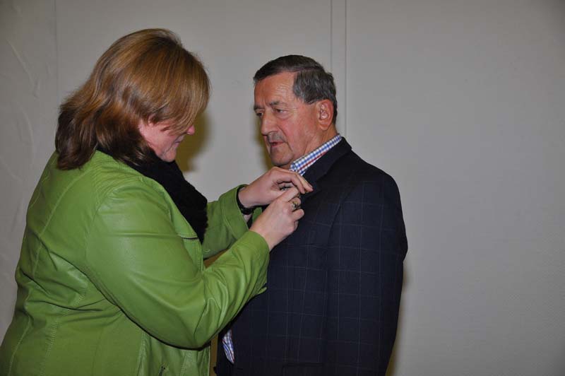 Frau Heggemann steckt Wolfgang die Ehrennadel an.