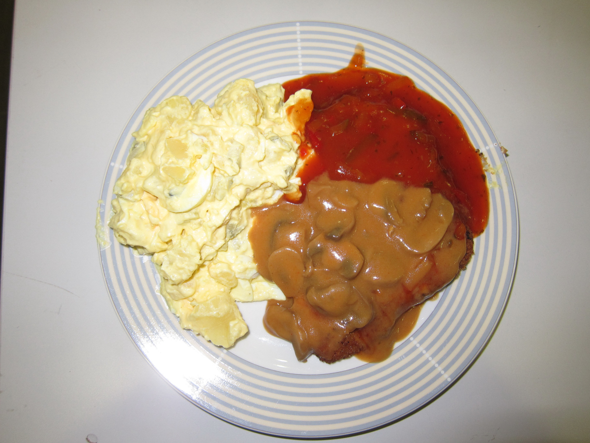 Lecker Schnitzel mit Zigeuener- oder Jägersausse (oder beidem) und Kartoffelsalat. |
