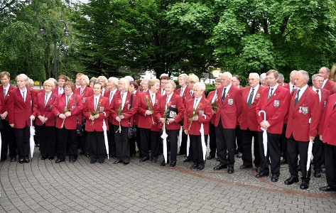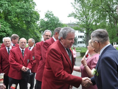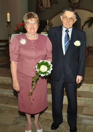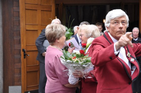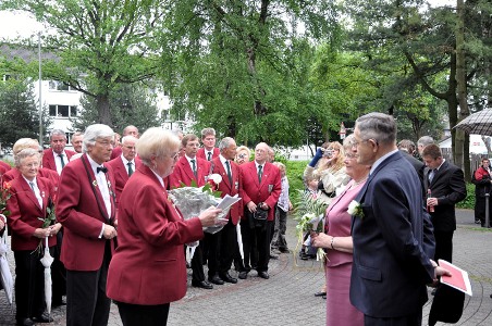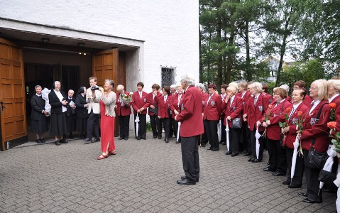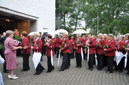 Unsere langjährige Alt-Sängerin Gertrud Brühl feierte mit ihrem Ehemann Bernhard am 12. Juni 2010 ihre goldene Hochzeit. Zahlreiche Chormitglieder hatten sich in der St. Michaelskirche Sennelager eingefunden, um die Messe musikalisch zu gestalten. "Das war ein wunderbarer, herrlicher Gesang!", lobte Gertrud. "Der Chor hat noch nie so gut gesungen!" - diese Meinung kann so allerdings nicht ganz stimmen! Aber dem Goldjubelpaar und den zahlreichen Gästen kam es so vor, und das ist die Hauptsache. Nach Gertruds Aussage war der Hubertus-Chor mit seinen Vorträgen und der großen Anzahl der Sängerinnen und Sänger noch lange ein Gesprächspunkt bei den Feierlichkeiten. Ist doch schön, wenn der Chor solch eine Begeisterung hervorrufen kann! |